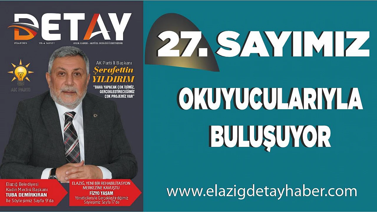 “Dört yıldan beri yayıncılık serüvenimiz tatlı bir koşuşturmayla sürüyor. Detay Dergimiz 27. Sayısına ulaşarak Elazığ’da en uzun soluklu yayıncılık yapan dergi konumuna geldi. Dergimizin yeni sayısında AK Parti İl Başkanı Şerafettin Yıldırım ile güzel bir söyleşi gerçekleştirdik. Tüm sorularımıza içtenlikle verdiği cevaplar dolayısıyla sayın başkana teşekkür ediyoruz. Her ay ilimiz gündemini yakından takip ediyor ve ekip arkadaşlarımızla güzel bir dergi çıkması adına gayret gösteriyoruz. İlk günden bugüne desteklerini esirgemeyen tüm kurum ve kuruluşlara, sponsor firmalara şükranlarımızı sunuyoruz.”