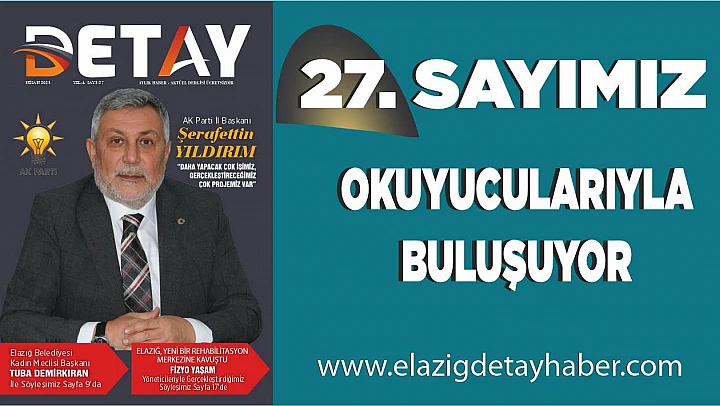 “Dört yıldan beri yayıncılık serüvenimiz tatlı bir koşuşturmayla sürüyor. Detay Dergimiz 27. Sayısına ulaşarak Elazığ'da en uzun soluklu yayıncılık yapan dergi konumuna geldi. Dergimizin yeni sayısında AK Parti İl Başkanı Şerafettin Yıldırım ile güzel bir söyleşi gerçekleştirdik. Tüm sorularımıza içtenlikle verdiği cevaplar dolayısıyla sayın başkana teşekkür ediyoruz. Her ay ilimiz gündemini yakından takip ediyor ve ekip arkadaşlarımızla güzel bir dergi çıkması adına gayret gösteriyoruz. İlk günden bugüne desteklerini esirgemeyen tüm kurum ve kuruluşlara, sponsor firmalara şükranlarımızı sunuyoruz.”