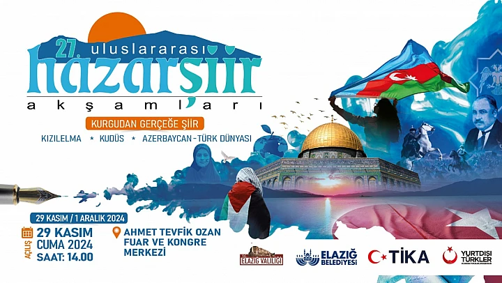 Elazığ Belediyesi'nin düzenleyeceği 27. Uluslararası Hazar Şiir Akşamları, 29 Kasım - 1 Aralık tarihleri arasında Ahmet Tevfik Ozan Fuar ve Kongre Merkezi'nde gerçekleştirilecek. 'Kurgudan Gerçeğe Şiir' ana teması altında ulusal ve uluslararası şair ve yazarları bir araya getirecek olan organizasyon, Ziya Gökalp, Ganire Paşayeva ve Nuri Pakdil anılarını yansıtacak.