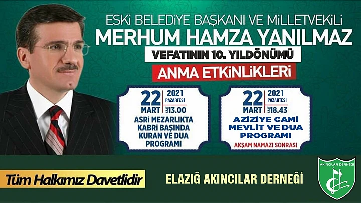 “Elazığ eski Milletvekili ve iki dönem Elazığ Belediye Başkanlığı görevinde bulunan kıymetli hocamız Hamza Yanılmaz'ı vefatının 10. yıldönümünde bir dizi etkinliklerle anacağız. Topluma örnek bir insan olan, inandığı yolda yürüyen ve iz bırakan merhum başkanımız geride bıraktığı eserlerle yaşatılacaktır. Akıncılar Derneği olarak geleneksel hale getirdiğimiz anma programı 22 Mart Pazartesi günü öğle namazını müteakip merhum hocamızın kabri başında düzenlenecek programla ardından akşam namazını müteakip Aziziye Cami'nde mevlit ve dua programı ile gerçekleşecek. Düzenleyeceğimiz anma etkinliklerine tüm hemşehrilerimizi bekliyor, bu duygu ve düşüncelerle dava adamı merhum Hamza Yanılmaz'ı rahmet ve şükranla anıyorum.”