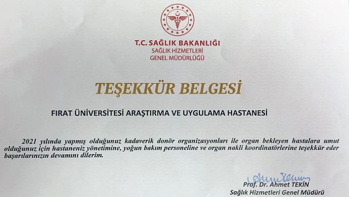 Sağlık Bakanlığı tarafından Fırat Üniversitesi Hastanesine kadaverik donör organizasyonları dolayısıyla teşekkür belgesi verildi.