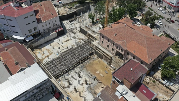 İnsan ve araç trafiğinin en yoğun olduğu bölgede, şehrin otopark ihtiyacına katkı sağlayacak yer altı otoparkı inşa çalışmaları kapsamında 1. katın kolon, perde ve döşeme çalışması gerçekleştiriliyor.