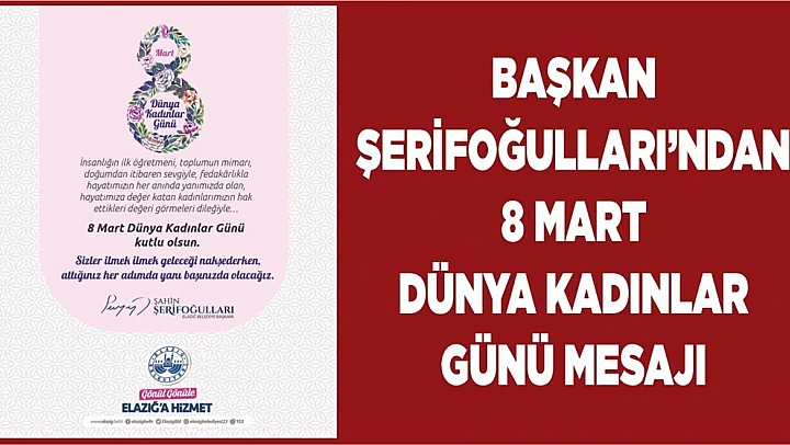 Elazığ Belediye Başkanı Şahin Şerifoğulları, 8 Mart Dünya Kadınlar Günü dolayısıyla bir mesaj yayımlayarak, “Hayatımızın her anında yaşamımıza değer katan kadınlarımızın 8 Mart Dünya Kadınlar Günü'nü tebrik ediyorum.” dedi.