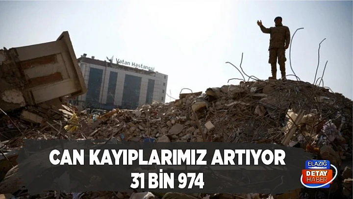 Son durumu aktaran AFAD, saat 13.50 itibarıyla depremde hayatını kaybedenlerin sayısının 31 bin 974'e yükseldiğini belirtti. AFAD'tan yapılan açıklamada, "Yaralı sayısı 80 bin 278, yıkılan bina sayısı 6 bin 444, 'yıkıldı' ihbarı gelen bina sayısı ise 11 bin 302 olarak açıklandı. Öte yandan 19 bin 300 yaralının ülke genelindeki hastanelerde tedavileri devam ediyor" denildi.