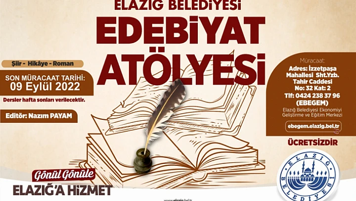 Elazığ Belediyesi Ekonomiyi Geliştirme ve Eğitim Merkezi tarafından vatandaşların yazarlık ve edebiyat konusundaki yeteneklerini desteklemek ve onların kalem tecrübelerini geliştirmek amacıyla 'Şiir-Hikâye-Roman' alanlarında düzenlenen Edebiyat Atölyesi çalışma başvuruları yoğun talep üzerine uzatıldı.