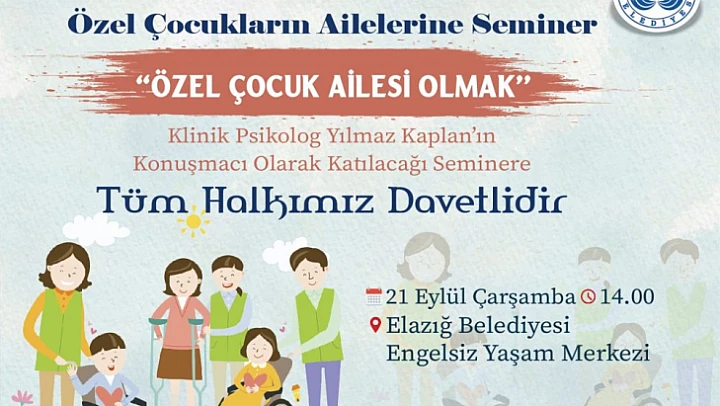 Elazığ Belediyesi Kültür ve Sosyal İşler Müdürlüğü tarafından özel gereksinimle çocukların ailelerine yönelik seminer düzenlenecek.