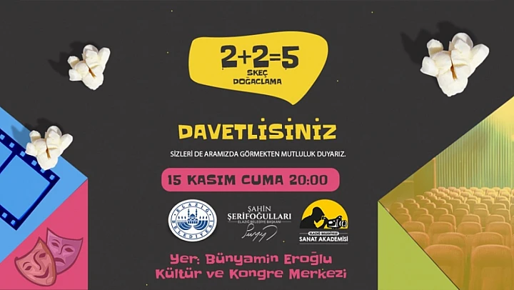 Geçtiğimiz dönemlerde sahne alan ve büyük beğeni toplayan “2+2=5” isimli skeç, kısa film ve doğaçlama, 15 Kasım Cuma akşamı saat 20.00'de Elazığ Belediyesi Bünyamin Eroğlu Kültür ve Kongre Merkezi'nde bir kez daha sahne alacak. Elazığ Belediyesi Kültür ve Sosyal İşler Müdürlüğü bünyesindeki çalışmalar doğrultusunda Sanat Akademisi'nin düzenleyeceği gösteri, ücretsiz olacak. Ayrıca, gösteri her ay periyodik olarak ücretsiz olarak sanatseverlerle buluşmaya devam edecek.