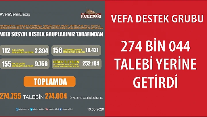 Elazığ şehir merkezinde ise valilik birimlerine 274 Bin 755 talepte bulunuldu. Vefa Sosyal Destek Grubu 274 Bin 004 vatandaşın talebini yerine getirdi.