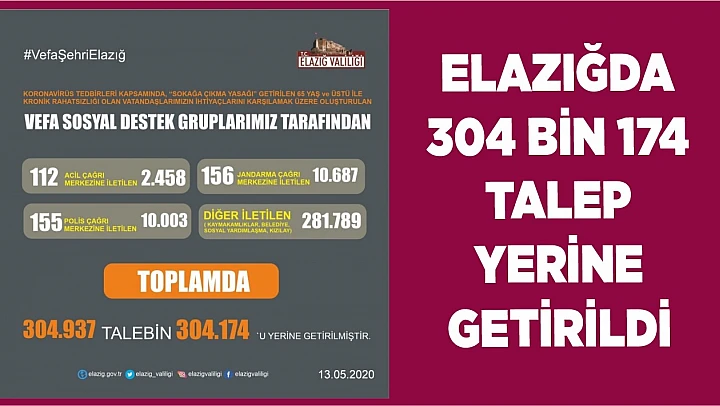 Valilik birimlerince ilçeler genelinde toplam bin başvuru alındı. Elazığ şehir merkezinde ise valilik birimlerine 304 Bin 937 talepte bulunuldu. Vefa Sosyal Destek Grubu 304 Bin 174 vatandaşın talebini yerine getirdi.