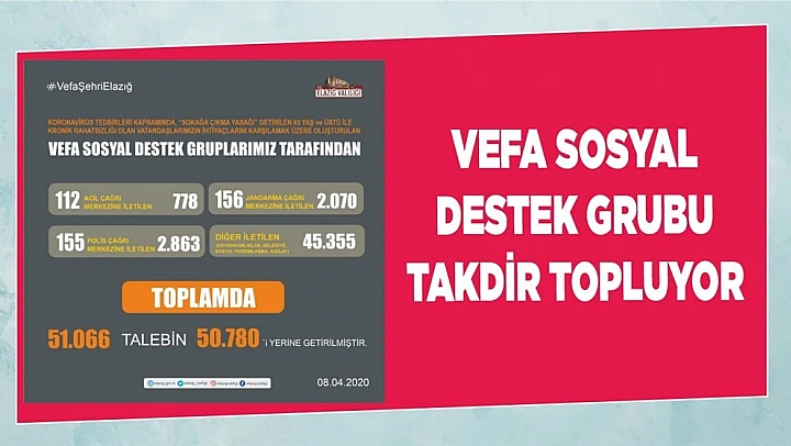 Elazığ şehir merkezinde ise valilik birimlerine 51 Bin 066 talepte bulunuldu. Vefa Destek Grubu 50 Bin 780 vatandaşın talebini yerine getirdi.