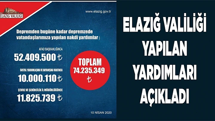 Elazığ Valiliği tarafından yapılan açıklamada; “Depremden bugüne kadar depremzede vatandaşlarımıza yapılan nakdi yardımlar; AFAD Başkanlığınca 52 Milyon 509 Bin 500 TL, Sosyal Yardımlaşma ve Dayanışma Vakfınca 10 Milyon 000 Bin 110 TL, Çevre ve Şehircilik İl Müdürlüğü'nce 11 Milyon 825 Bin 739 TL, toplam 74 Milyon 235 Bin 349 TL” denildi.