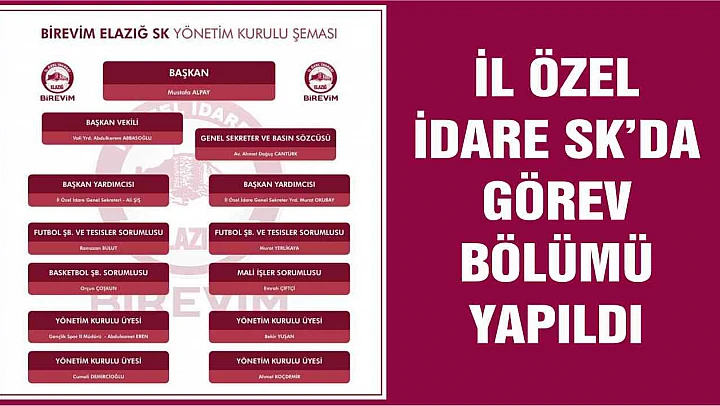 Türkiye Kadınlar Basketbol Süper Lig ekiplerinden Elazığ İl Özel İdarespor'da Olağanüstü Genel Kurul sonrası göreve gelen Mustafa Alpay başkanlığındaki yönetim kurulu görev dağılımı gerçekleştirdi. 13 kişiden oluşan yönetim kurulunda Futbol Şube Sorumluluklarına Ramazan Bulut ile Murat Yerlikaya, Basketbol Şube Sorumluluğuna ise Orçun Coşkun getirildi.