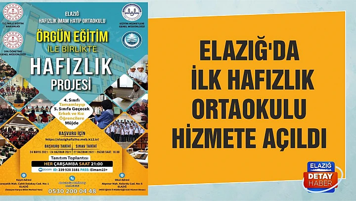 Elazığ'da yeni bir proje okulu olan, Hafızlık ortaokulu açıldı. Elazığ İl Milli Eğitim Müdürlüğü,İmam Hatip Hafızlık ortaokuluna başvuru için https://elazighafiziho.meb.k12tr/ adresinden 24 Mayıs- 24 Haziran tarihleri arasında yapabileceklerini duyurdu. Sınav tarihini ise 27 Haziran Pazar günü saat: 10.00'da yapılacağını duyurdu.