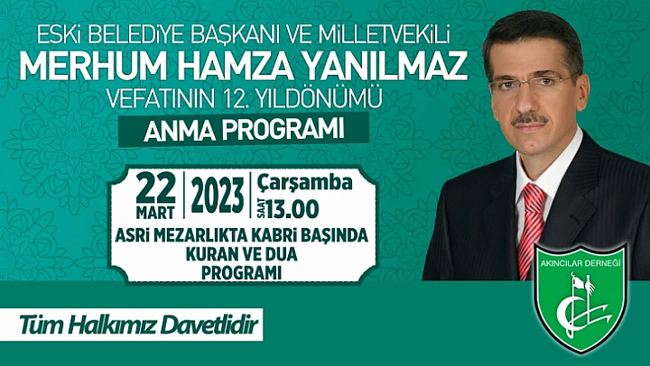 “Altınyumruk Spor okulunda binlerce gencin milli ve manevi değerlerle yetişmesine vesile olan, Belediye Başkanlığı ve milletvekilliği görevlerinde şehrimize unutulmaz hizmetler yapıp sayısız eserler bırakan Hamza Yanılmaz hocamızı bu yıl da vefatının 12. Yıldönümünde anıyoruz. Bu kapsamda 22 Mart Çarşamba günü saat 13.'te Asri mezarlıktaki kabri başında Kur'an okuyup dualar edeceğimiz programa tüm hemşerilerimi davet ediyorum” dedi.