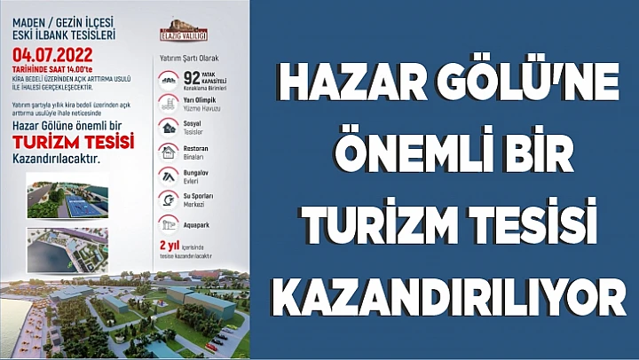 Elazığ Valiliği'nden konuyla ilgili yapılan açıklamada, "Maden'in Gezin ilçesinde bulunan eski İLBANK tesisleri 04.07.2022 tarihinde saat: 14.00'te kira bedeli üzerinden açık arttırma usulü ile ihalesi gerçekleşecektir. Yatırım şartıyla yıllık kira bedeli üzerinden açık arttırma usulüyle ihale neticesinde hazar gölüne önemli bir turizm tesisi kazandırılacaktır. Bu kapsamda yatırım şartı olarak 92 yatak kapasiteli konaklama birimleri, yarı olimpik yüzme havuzu, sosyal tesisler, restoran binaları, bungalov evleri, su sporları merkezi, aquapark 2 yıl içerisinde tesise kazandırılacak” ifadeleri yer aldı.