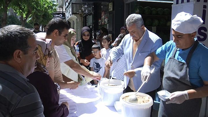 Elazığlı İş İnsanı Aytunç Sunguroğlu, Muharrem ayı dolayısıyla Gazi Caddesi'ndeki şubesi önünde vatandaşlara aşure ikramında bulundu.