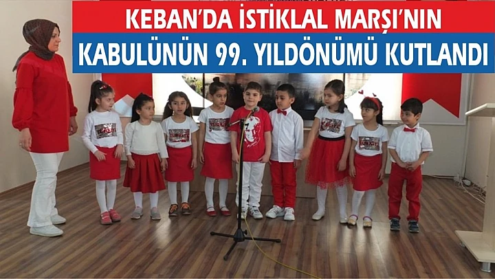 Vatan şairi Mehmet Akif Ersoy'un yazdığı İstiklal Marşı'nın kabulünün 99. yıl dönümü Keban ilçesinde törenle kutlandı. Milli Eğitim Müdürlüğü Hacı Fevzi Efendi Konferans salonunda düzenlenen program Keban Musa Coşkun Ortaokulu öğretmeni Zeynep Çiftçi günün anlam ve önemini anlatan konuşma yaptı. Musa Coşkun Ortaokulu Görsel sanatlar öğretmeni yönetimindeki öğrenciler Fatmagül Turan'ın okuduğu İstiklal Marşı eşliğinde Mehmet Akif Ersoy Tuvali üzerinde canlı performans gösterisi yapıldı, anaokulu öğretmeni Asuman Ceylan koordinesinde anaokulu öğrencileri İstiklal Marşının 10 kıtasını okudu.