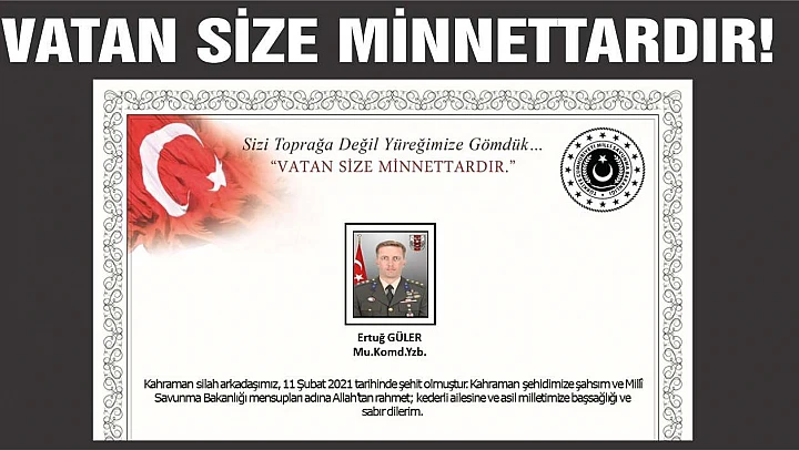 Son dakika haberine göre Pençe Kartal-2 Harekatı'nda yaralanan Yüzbaşı Ertuğ Güler şehit oldu. Şehidimize Yüce Allah'tan rahmet, ailesine ve tüm sevdiklerine başsağlığı dileklerimizi iletiriz. Milletimizin başı sağolsun.