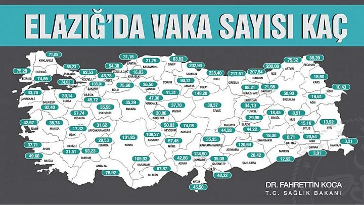 Sağlık Bakanı Fahrettin Koca, il il korona virüs vakalarını açıkladı. Bakan Koca'nın açıkladığı verilere göre, bir haftada Elazığ'da 100 binde 44,22 kişide virüs tespit edildi.