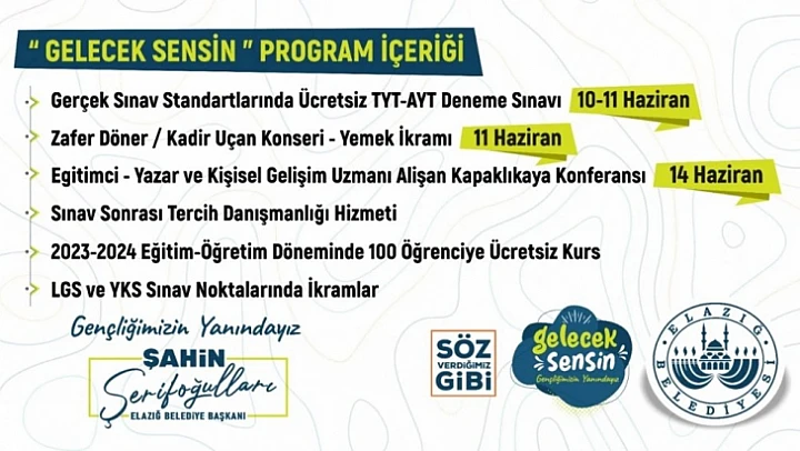 Elazığ Belediyesi tarafından gençlere yönelik eğitime destek çalışmaları kapsamında hazırlanan ücretsiz deneme sınavı, konser, seminer ve sınav sonrası ücretsiz rehberlik hizmetlerinden oluşan "Gelecek Sensin" programı başlıyor. Elazığ Belediyesi Kültür ve Sosyal İşler Müdürlüğü-KURS-DER iş birliğiyle YKS'ye girecek öğrencilere yönelik merkezi sınav öncesi, sınav stresini azaltmak ve gerçek sınav deneyimi sağlamak amacıyla gerçekleştirilecek ücretsiz deneme sınavının birinci oturumu olan TYT 10 Haziran Cumartesi günü saat 10.00'da, ikinci oturumu olan AYT ise 11 Haziran Pazar günü saat 10.00'da yapılacak.