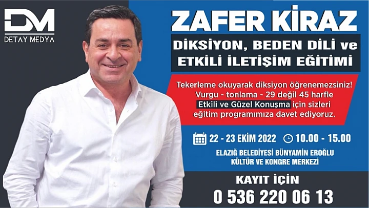 “Uzun yıllardır TRT ekranlarında büyük bir beğeni ile takip ettiğimiz alanında uzman isimlerden Zafer Kiraz, Elazığlılarla buluşacak. ‘Diksiyon, Beden Dili ve Etkili İletişim' konulu eğitim programı 22 – 23 Ekim tarihleri arasında Elazığ Belediyesi Bünyamin Eroğlu Kültür ve Kongre Merkezi'nde gerçekleşecek olup, eğitim sonrasında katılımcılara sertifika sunulacak.”