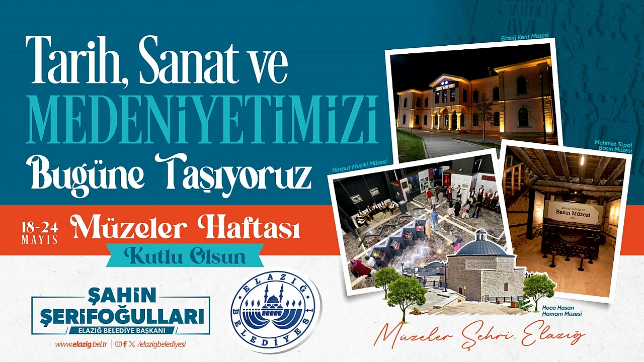 Başkan Şerifoğulları mesajında şu ifadelere yer verdi; “Müzeler, geçmişi koruyarak bugünü anlamamıza ve geleceği bilinçle şekillendirmemize yardımcı olan kültürel hafızalardır. Elazığ Belediyesi olarak eşsiz kültürel hazinelerimizin korunması, saklanması ve sergilenmesi hizmetlerinin sürdürüldüğü müzelerin yaygınlaştırılmasına büyük önem veriyoruz. Bu kapsamda 'Müzeler Şehri Elazığ' projemiz doğrultusunda Harput’umuza Musiki Müzemizi, Basın Müzemizi, Hoca Hasan Hamam Müzemizi ve merkezi konumda bulunan Kent Müzemizi aziz şehrimize kazandırmanın gurur ve mutluluğunu yaşıyoruz. Şehrimizin turizminin gelişmesinde ve canlanmasında da etkin rol oynayan bu müzelerimizde, modern müzecilik anlayışı dönemini ziyaretçilerin beğenisine sunuyor, yakın ve kadim geçmişimizin kültürel mirasını vatandaşlarımıza ve gelecek nesillere aktarmaya devam ediyoruz.