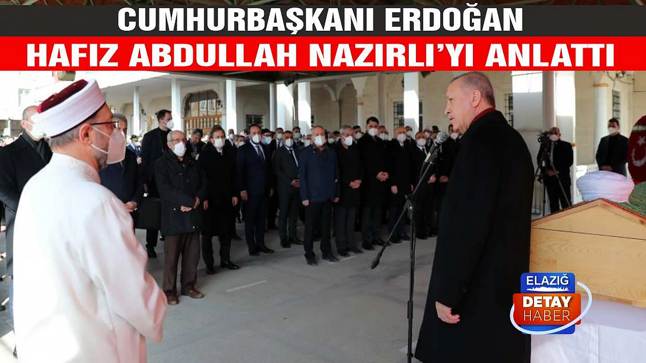 Hayatını kaybeden Elazığ'ın Kanaat önderi Hafız Abdullah Nazırlı’nın İzzetpaşa Camisi’ndeki cenaze törenine katılan Cumhurbaşkanı Recep Tayyip Erdoğan, cenaze namazının kılınmasının hemen ardından açıklama yaptı. Cumhurbaşkanı Erdoğan, konuşmasında Hafız Abdullah Nazırlı ile yaptıkları son görüşmeyi ve merhum Nazırlı'nın vasiyetini açıkladı.