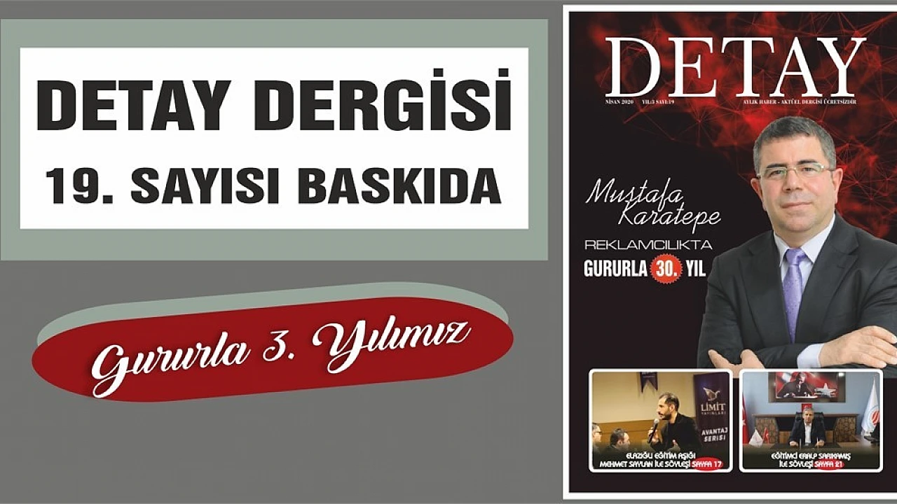 Elazığ’da üç yıldan beri yayın hayatını istikrarlı bir şekilde sürdüren aylık haber - aktüel dergisi Detay, 19. sayısıyla okuyucularıyla buluşuyor. Derginin Nisan sayısının kapağında Elazığ’da 30 yıldan beri reklam sektöründe hizmet veren Mustafa Karatepe’nin çalışmalarına yer verildi.