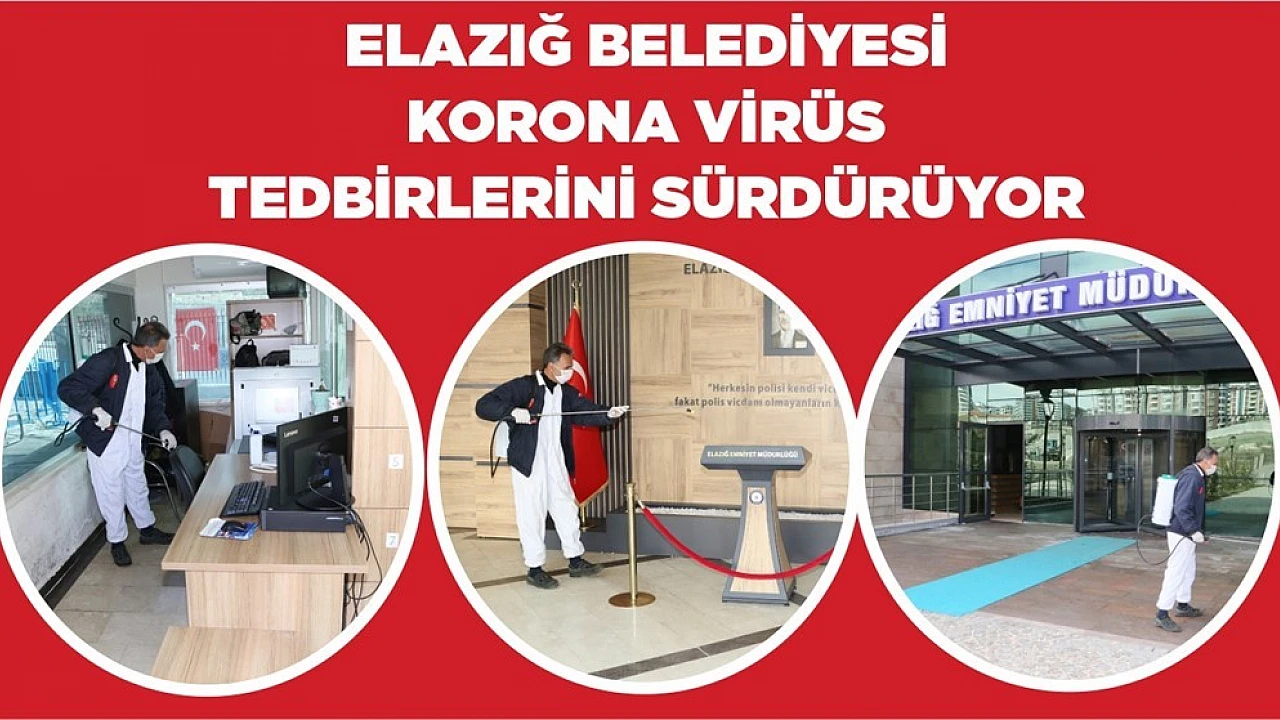Elazığ Belediyesi ekipleri toplu kullanım alanlarında 7/24 kesintisiz sürdürdüğü dezenfeksiyon çalışmalarına ek olarak Emniyet Müdürlüğü, Elazığ Adliyesi, 8. Kolordu Komutanlığı başta olmak üzere kurum ve kuruluşlarda da dezenfeksiyon sağlıyor.