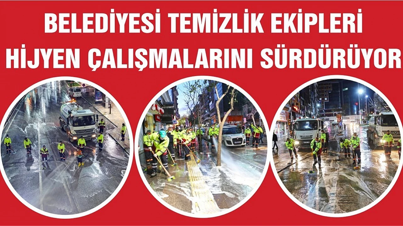 Şehrin dört bir yanında başlatılan hijyen seferberliği doğrultusunda; cadde ve sokaklar, meydanlar, parklar, otobüs durakları gibi alanlar buharlı ve basınçlı temizlik araçlarıyla özel solüsyonlarla yıkanarak, hijyen sağlanıyor. 7/24 çalışmalarını kesintisiz sürdüren Temizlik Müdürlüğü’ne bağlı ekiplerin yürüttükleri çalışmalar doğrultusunda çöp konteynerleri de çöplerin alınmasının ardından önce konteyner yıkama makinesi ile yıkanıyor ardından da dezenfektanlarla dezenfekte ediliyor.