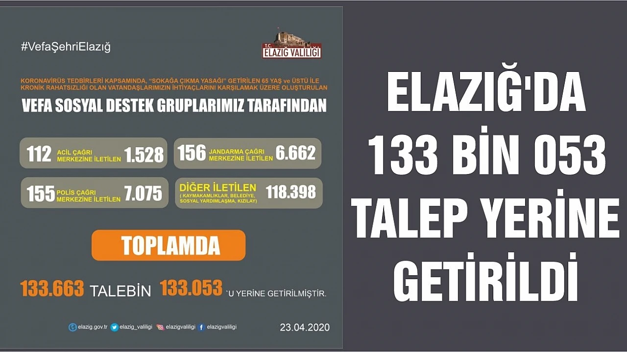 Elazığ Valiliği bünyesinde kurulan ekipler 65 yaş ve üzeri vatandaşların ihtiyaçlarını gidermeye devam ediyor. Bu kapsamda; 112 / 155 / 156 ve diğer başvuru yolları olmak üzere vatandaşların talepleri tek tek alınıyor. Valilik birimlerince ilçeler genelinde toplam bin başvuru alındı. Elazığ şehir merkezinde ise valilik birimlerine 133 bin 663 talepte bulunuldu. Vefa Sosyal Destek Grubu 133 bin 053 vatandaşın talebini yerine getirdi.