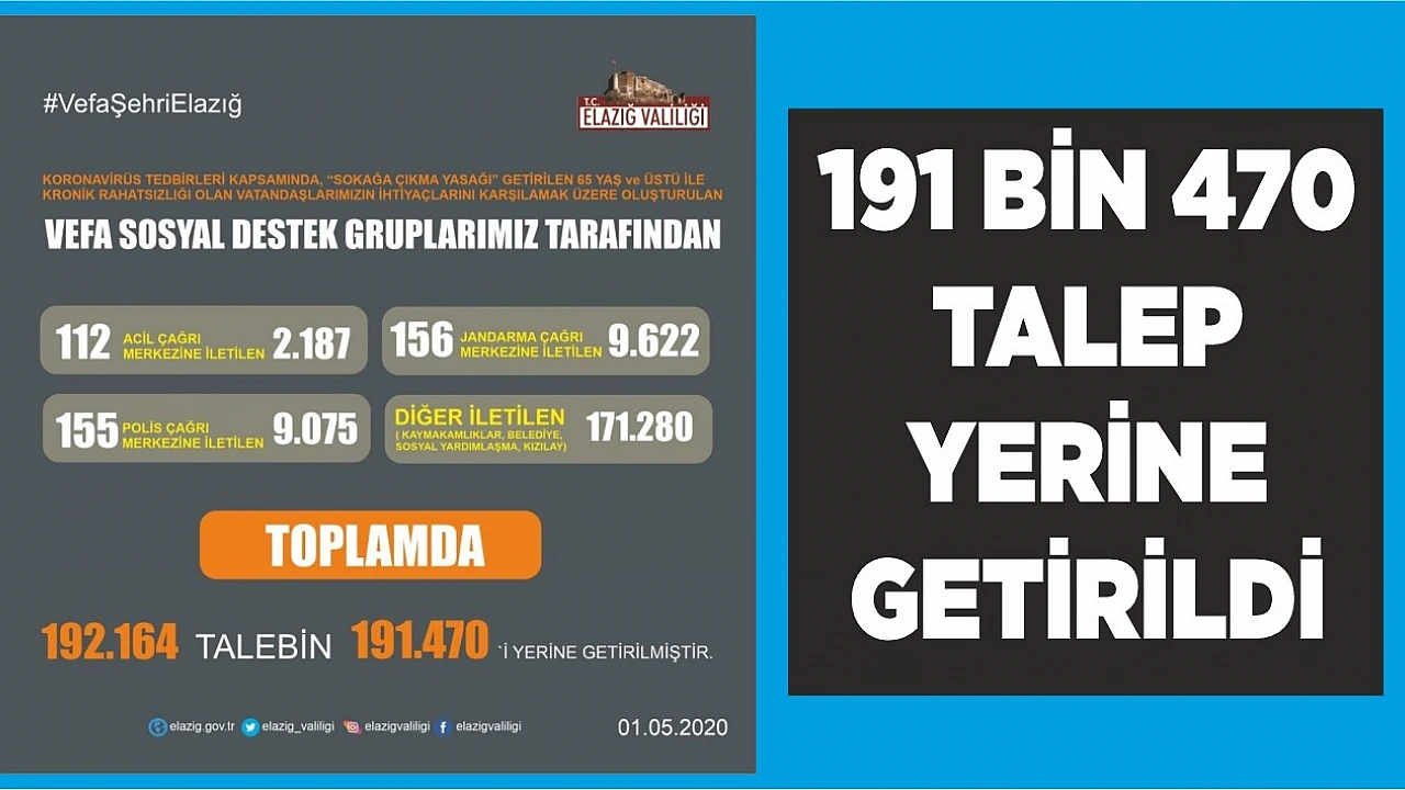 Elazığ şehir merkezinde ise valilik birimlerine 192 Bin 164 talepte bulunuldu. Vefa Sosyal Destek Grubu 191 Bin 470 vatandaşın talebini yerine getirdi.