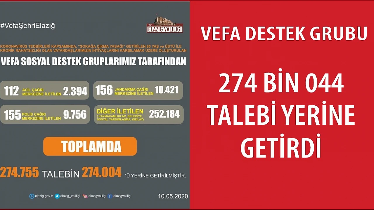 Elazığ şehir merkezinde ise valilik birimlerine 274 Bin 755 talepte bulunuldu. Vefa Sosyal Destek Grubu 274 Bin 004 vatandaşın talebini yerine getirdi.
