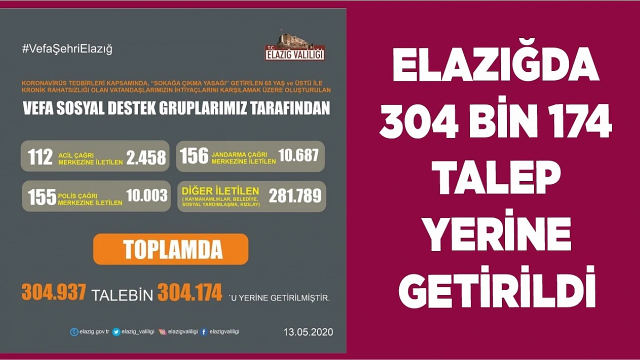 Valilik birimlerince ilçeler genelinde toplam bin başvuru alındı. Elazığ şehir merkezinde ise valilik birimlerine 304 Bin 937 talepte bulunuldu. Vefa Sosyal Destek Grubu 304 Bin 174 vatandaşın talebini yerine getirdi.