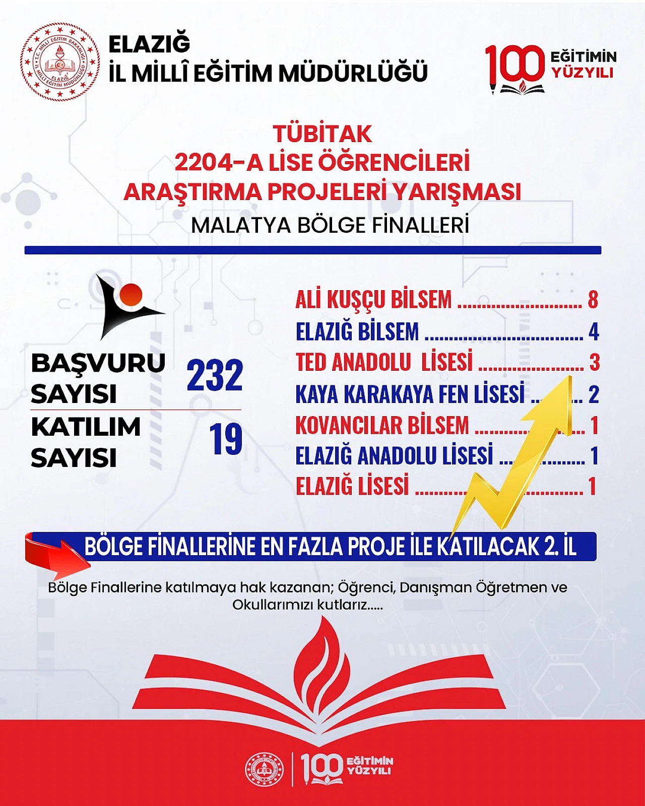 Elazığ, bu sonuçla Malatya Bölge Finalleri'nde yarışacak 8 il arasında en fazla proje ile katılacak olan 2. il olma başarısını da gösterdi.