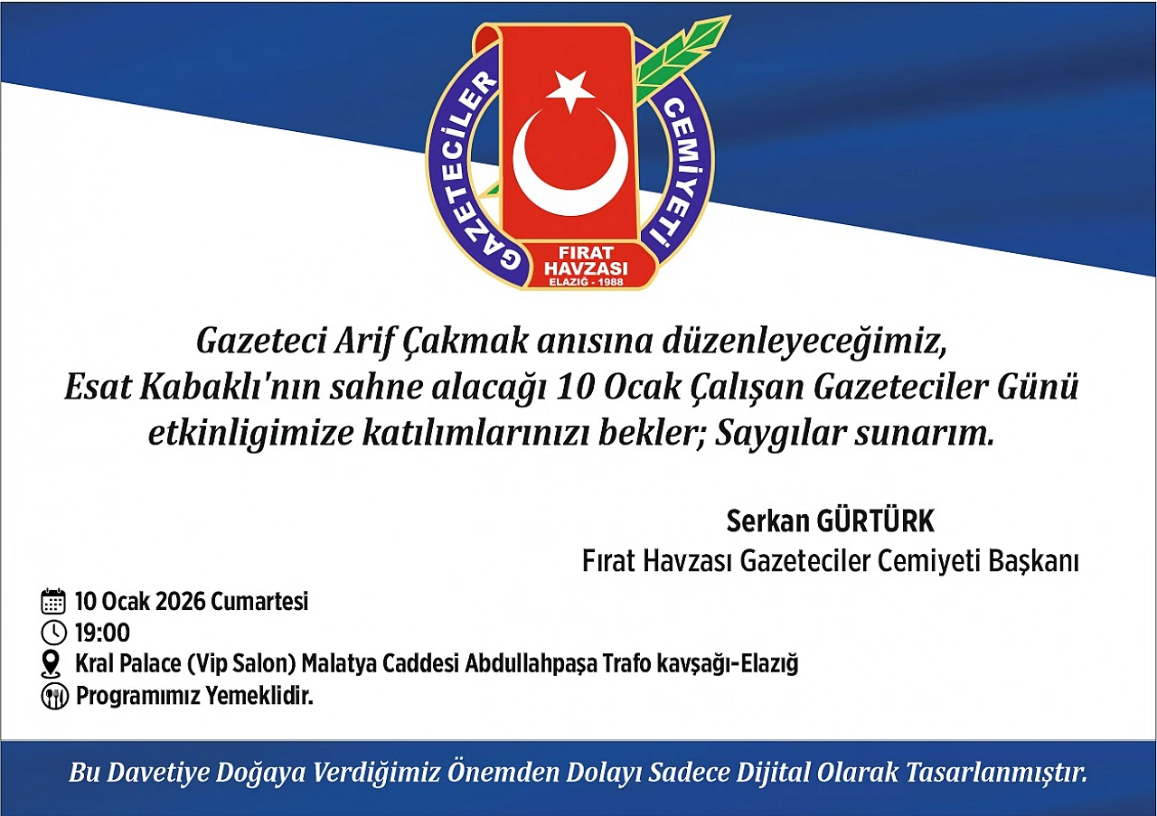 FHGC Başkanı Serkan Gürtürk, 10 Ocak Çalışan Gazeteciler Günü’nde düzenlenecek programda sadece medya mensuplarının yer almayacağını Elazığ’daki STK’ların da bulunacağını belirterek böylesi anlamlı bir programa basın emekçileri ile STK yetkililerinin davetli olduğunu kaydetti. Gürtürk, yaşamı boyunca Elazığ medyasına büyük emekleri olan merhum Arif Çakmak’ın hatırasının her daim yaşatılacağını sözlerine ekledi.