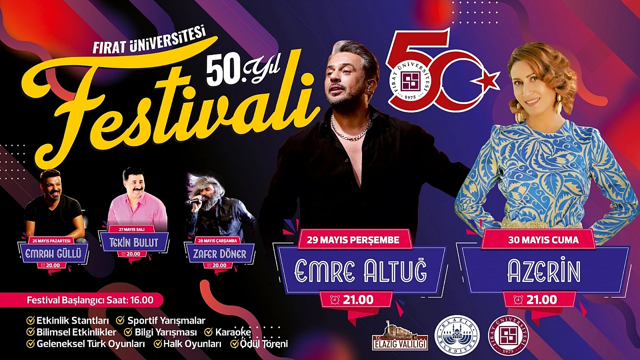 Fırat Üniversitesi, kuruluşunun 50. yılını çeşitli etkinliklerle kutlamaya devam ediyor. 26-30 Mayıs tarihleri arasında gerçekleştirilecek olan “Fırat Üniversitesi 50. Yıl Festivali”, konserlerden bilimsel etkinliklere, sportif etkinliklerden geleneksel oyunlara kadar pek çok programla üniversite öğrencilerine ve Elazığ halkına unutulmaz bir hafta yaşatacak.
