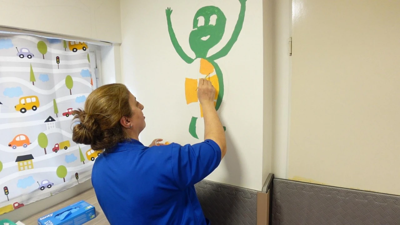 “Minik Kahramanlar Oyun Bahçesi” adı verilen bu alan, sağlık çalışanlarının katkılarıyla hayata geçirilirken, duvarları çocukların ilgisini çekecek çizgi film kahramanları ile süslendi.