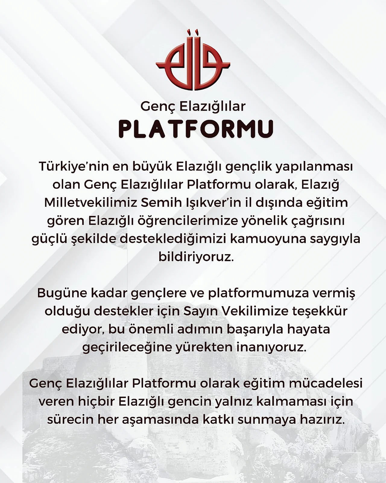 Platform tarafından yapılan açıklamada; “Genç Elazığlılar Platformu olarak, Elazığ Milletvekilimiz Semih Işıkver’in il dışında eğitim gören Elazığlı Öğrencilerimize yönelik çağrısını güçlü şekilde desteklediğimizi kamuoyuna saygıyla bildiriyoruz. Bugüne kadar gençlere ve platformumuza vermi olduğu destekler için sayın vekilimize teşekkür ediyor, bu önemli adımın başarıyla hayata geçirileceğine yürekten inanıyoruz.