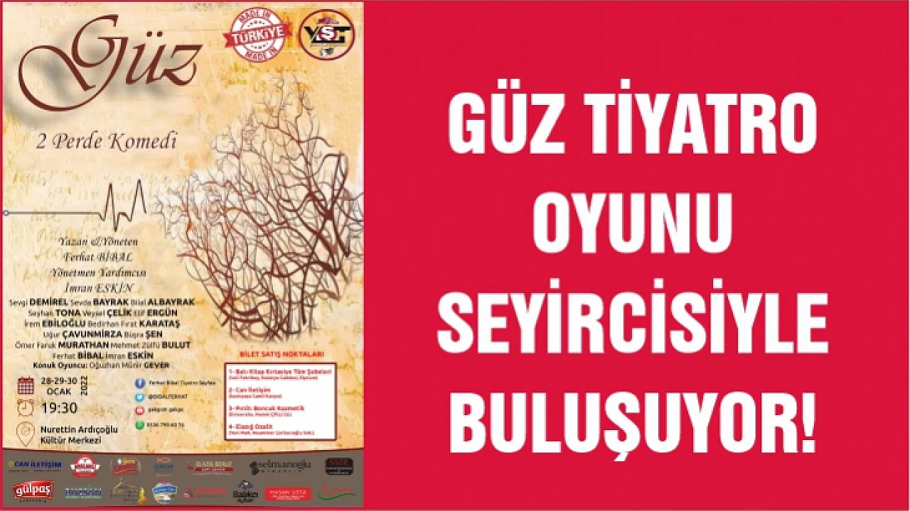 Yaklaşık iki yıl önce yazılmış olan Güz adlı tiyatro oyunu 28, 29, 30 Ocak 2022 tarihinde Elazığ Nurettin Ardıçoğlu Kültür Merkezi'nde saat 19:30'da seyircinin karşısına çıkacak.