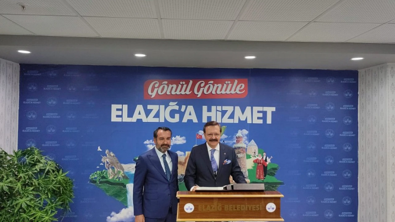 Başkan Rifat Hisarcıklıoğlu ve beraberindeki heyeti makamında ağırlayan Elazığ Belediye Başkanı Şahin Şerifoğulları, 42 aylık hizmet sürecinde Elazığ’a kazandırdıkları yatırımları anlattı.
