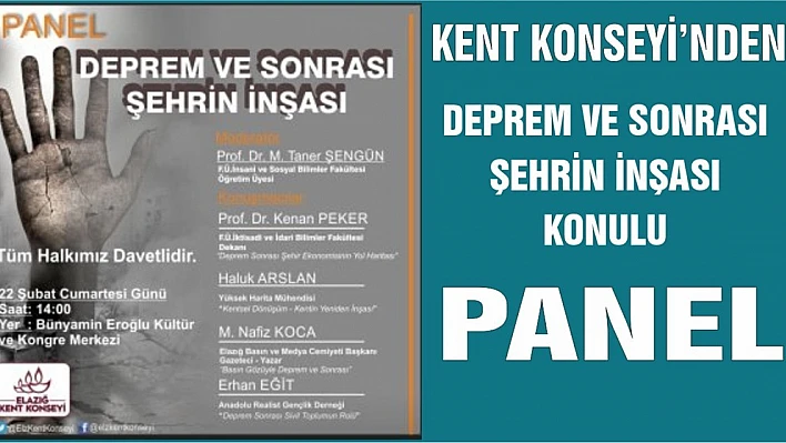 “İlimizde yaşanan depremin ardından, şehrimizde 20.000 bağımsız bölümün ağır hasarlı olduğu, nitelikli göç verip niteliksiz göç alacağımız, şehrin ekonomik, sosyal ve kültürel dengelerinin değişeceği gerçeğinden hareketle, Elazığ Kent Konseyimiz tarafından “DEPREM VE SONRASI ŞEHRİN İNŞASI” konulu bir panel düzenlenecektir.