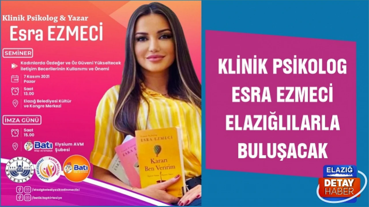 Bu doğrultuda Elazığ Belediyesi Kültür ve Sosyal İşler Müdürlüğü ile Elazığ Belediyesi Kadın Meclisi’nin ortaklaşa düzenlediği program çerçevesinde, Uzman Psikolog ve Yazar Esra Ezmeci Elazığlılarla buluşacak.