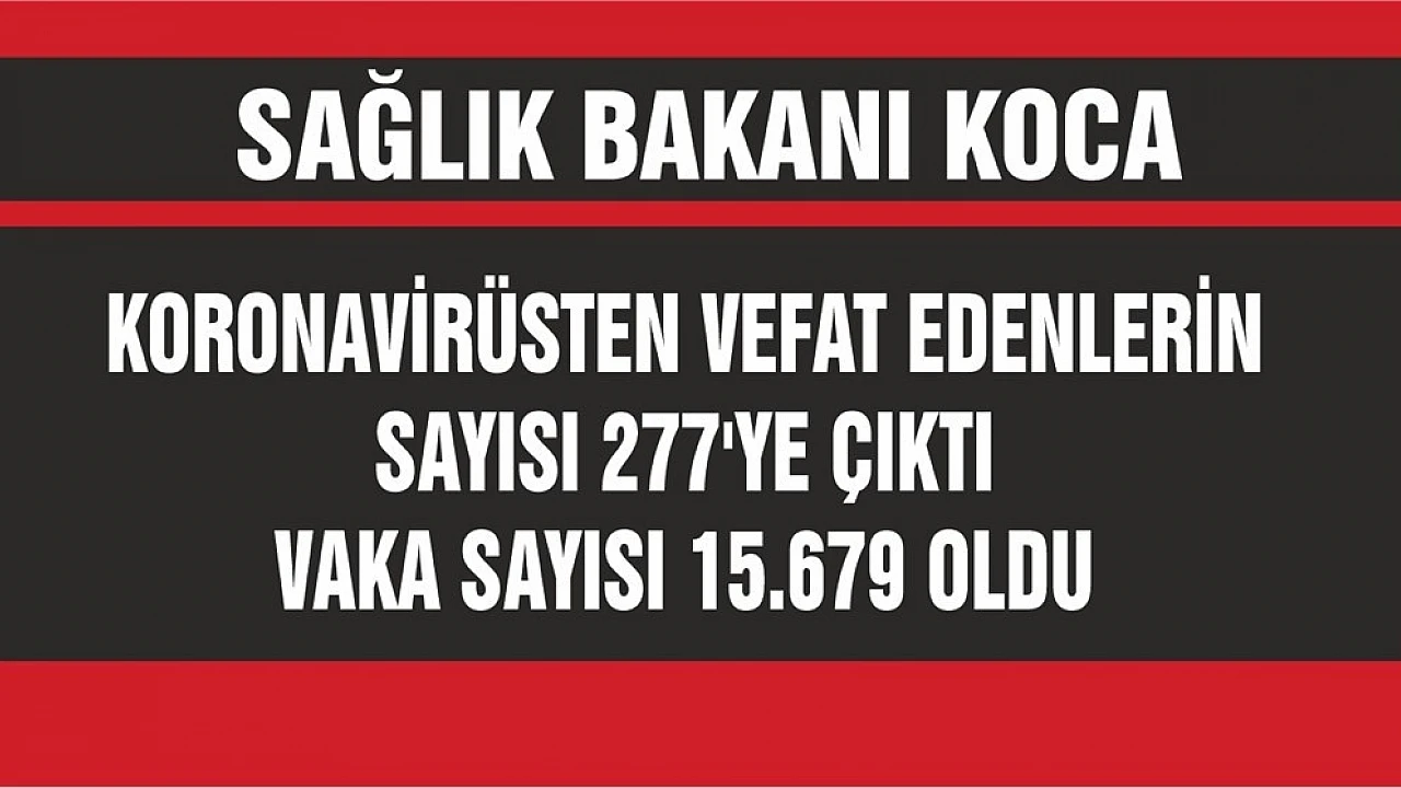 Bakan Koca Koronavirüsten bugün 63 kişinin vefat ettiğini, toplam vefat edenlerin sayısının 277 kişiye ulaştığını belirterek, vaka sayısının da 15 bin 679 kişiye ulaştığını söyledi.