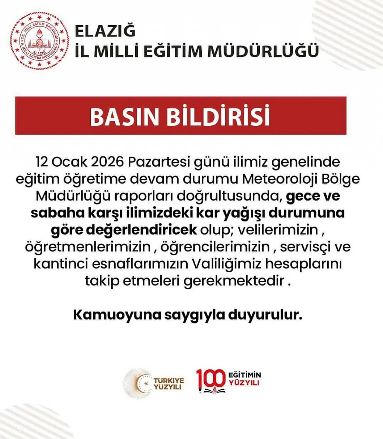 Elazığ İl Millî Eğitim Müdürlüğü, 12 Ocak 2026 Pazartesi günü eğitime devam edilip edilmeyeceğinin, gece ve sabaha karşı beklenen kar yağışının durumuna göre değerlendirileceğini açıkladı. Karara ilişkin gelişmeler için velilerin, öğretmenlerin, öğrencilerin, servisçi ve kantinci esnafın Valilik hesaplarını takip etmeleri istendi.