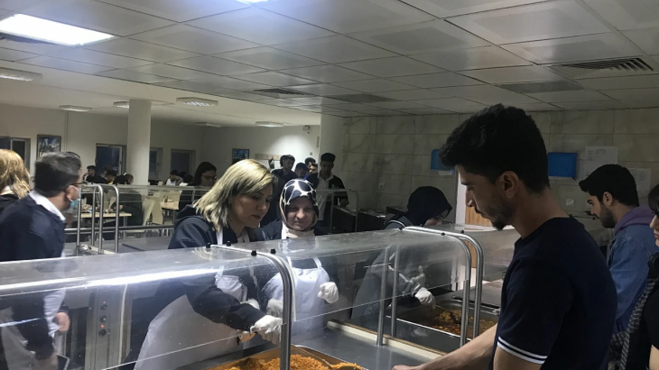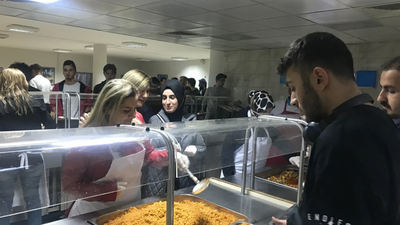 Fırat Üniversitesi Kadın Kolları Başkanı Hülya Göktaş ile Teknoloji Fakültesi Dekanı Prof. Dr. Bahar Demirel İftar öncesi öğrencilerin yemeklerini elleriyle dağıttı.