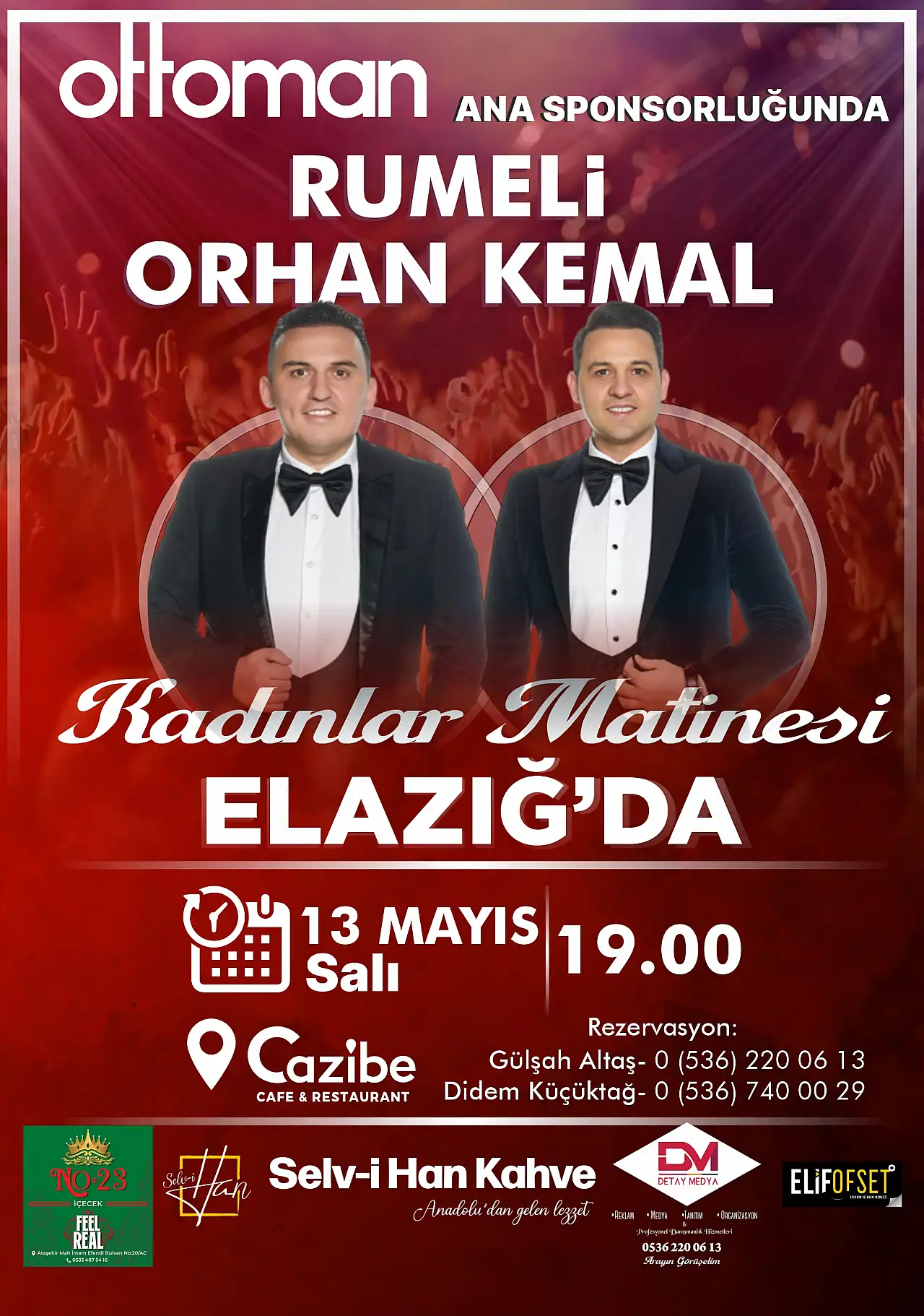 Rumeli Orhan ve Kemal'in sahne alacağı Kadınlar Matinesi 13 Mayıs'ta Elazığ'da yapılacak. Elazığ, kadınlara özel eğlenceli bir etkinliğe daha ev sahipliği yapacak.