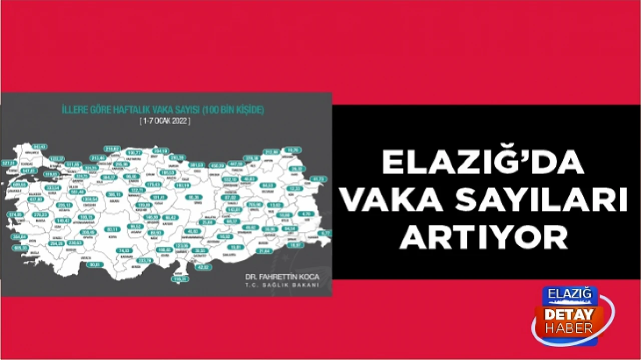 İllere göre 1-7 Ocak döneminde Kovid-19 vaka sayısı her 100 bin kişide Elazığ’da 68,37 oldu. Elazığ’da vaka sayılarında geçtiğimiz haftaya oranla bir artış yaşandığı gözlendi.